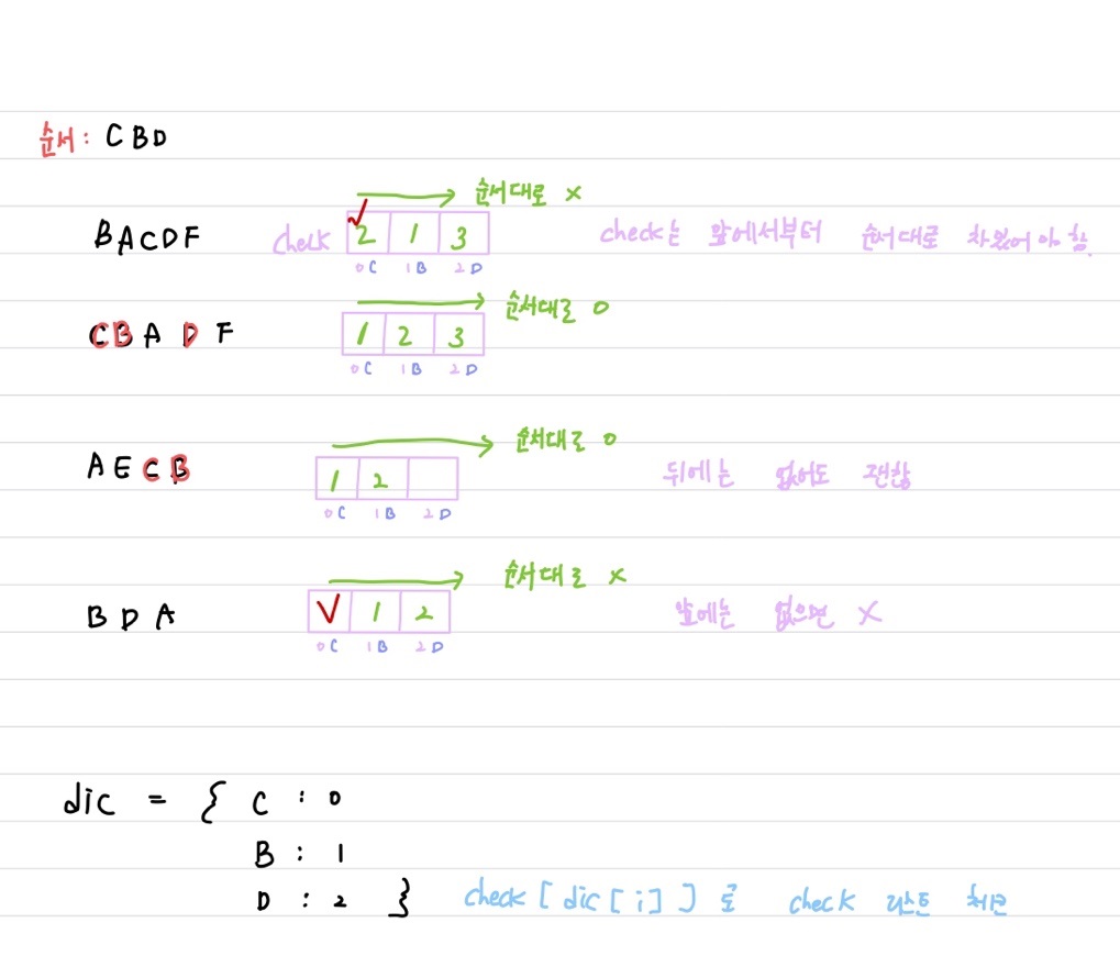 - check[1]이 true인데 check[0]이 false이다 ====> 잘못된 스킬트리!