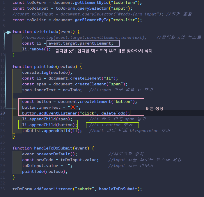 1. document.creatElement로 버튼 생성 -> x 텍스트 추가 -> 이벤트 리스너 추가